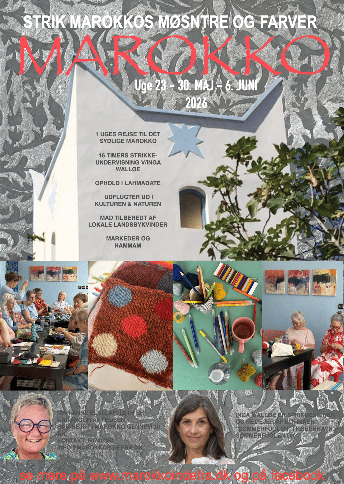 Har du lyst til at give dig selv en god oplevelse? Give dig selv tid og rum til fordybelse i strik, garn og farver? Lære at bruge farver på en ny måde og få fif og teknikker til at mestre mange farver på én gang? Så er Strik med Marokkos farver lige det du søger.