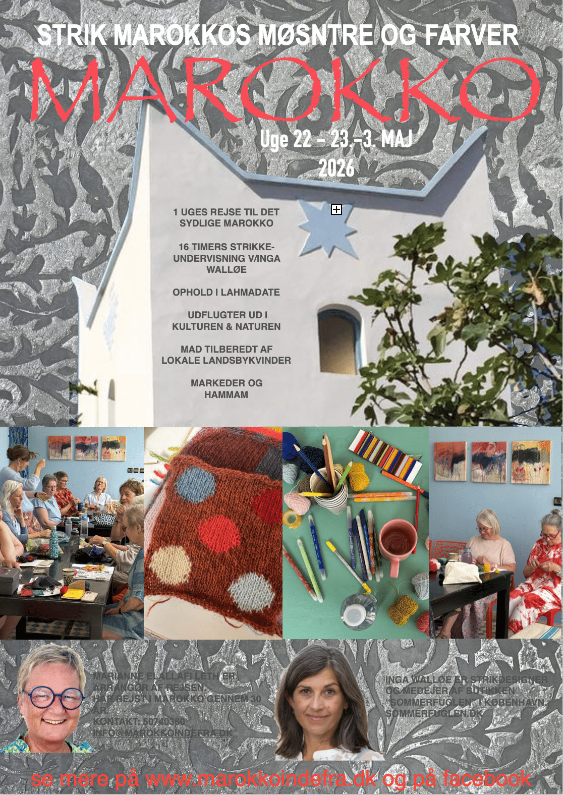 Inga Walløe er strikdesigner og medindehaver af butikken “Sommerfuglen” i København. Marokkos farver venter på at “hoppe ombord” i jeres strikketøj. Bliv inspireret af Inga og Marokkos mange farver og mønstre. En uge med leg, inspiration, ro, hyggeligt samvær og ture ud af huset